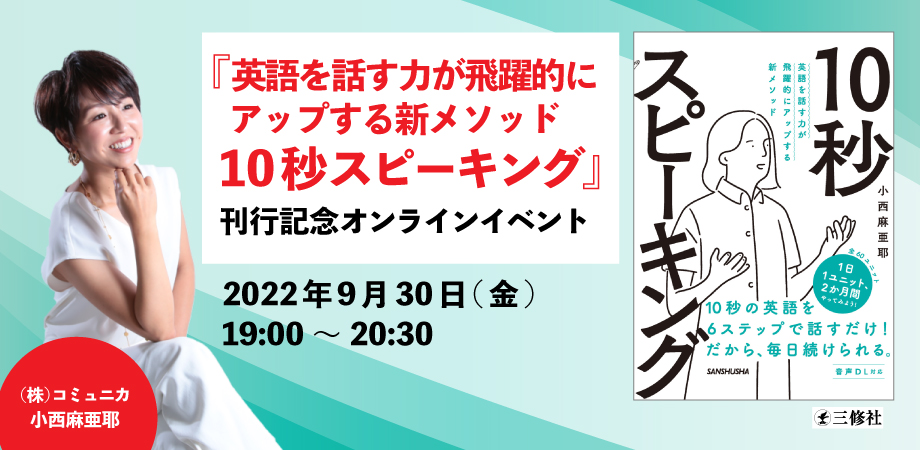 ベストセラー『英語を聞きとる力が飛躍的にアップする新メソッド 10秒リスニング』の姉妹編『英語を話す力が飛躍的にアップする新メソッド 10秒スピーキング』(三修社、2022年9月発売)の新刊発売を記念して、小西麻亜耶先生によるウェビナーを開催いたします。